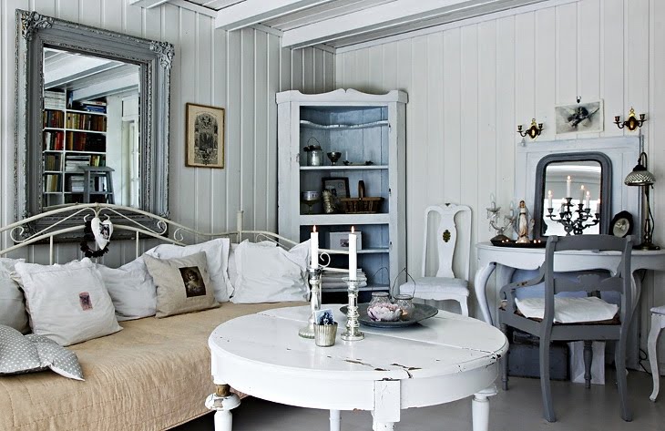 A mesa de centro foi encontrada abandonada em um celeiro. Tudo o que é encontrado - mesas, cadeiras, prateleiras, caixas ou cestos - é pintado de branco ou cinza para se adequar ao estilo escolhido.